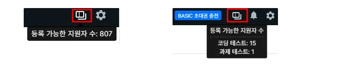 이용 가능한 초대권이 있는 지 확인해주세요.이용 가능한 초대권이 있어야 응시자를 등록할 수 있습니다.오른쪽 상단의 아이콘에 마우스를 올리면 이용 가능한 초대권(등록 가능한 지원자 수)를 확인할 수 있습니다.