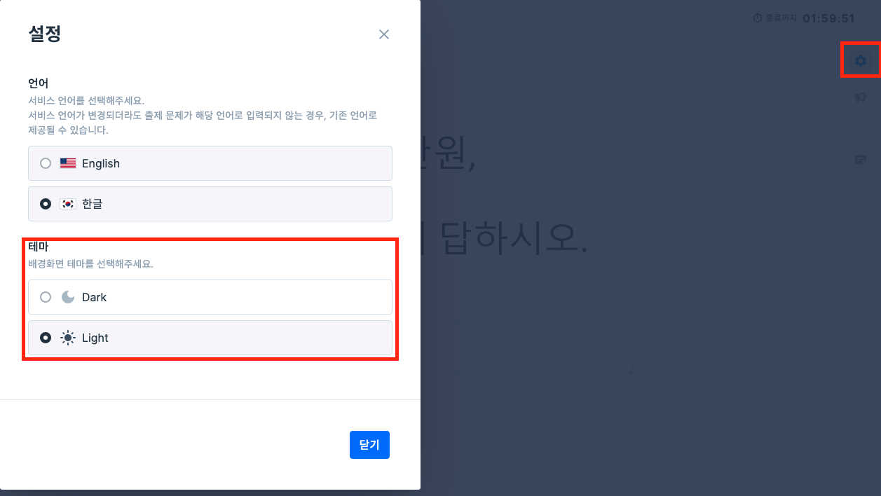 설정 페이지의 우측 사이드바의 설정을 통해 테마를 Light로 변경하면 조치 가능합니다.