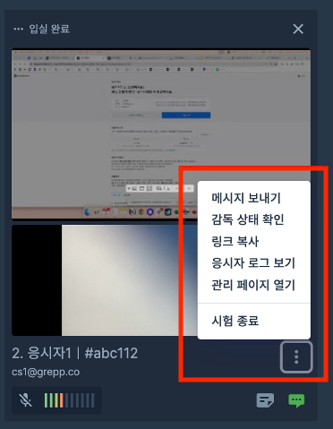 감독실에서 응시자 화면의 메뉴를 선택하신 후 시험 종료 항목을 클릭해주세요.