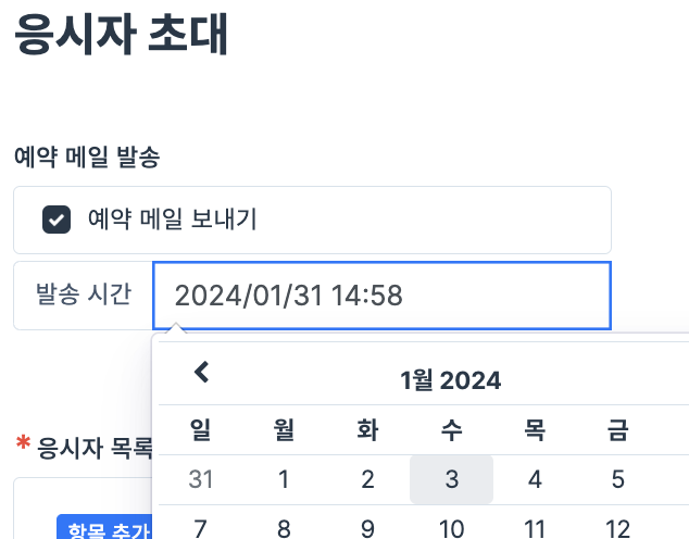 응시자 등록 → 예약 메일 보내기 체크 → 발송 일자 및 시간을 설정해주세요.