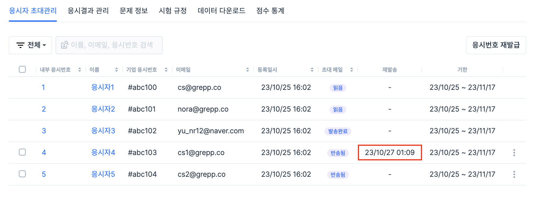 테스트 페이지 하단 응시자 목록에서 초대 메일 발송/열람 상태를 확인 할 수 있습니다.
